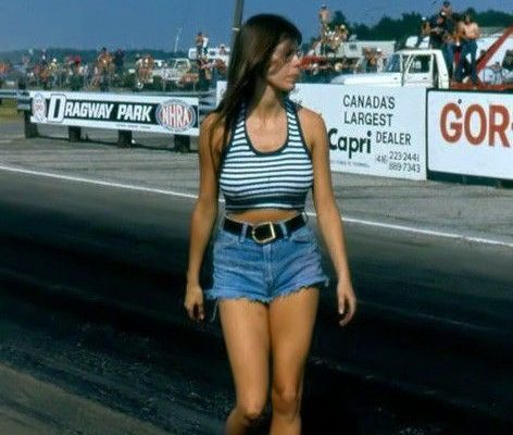Pam quickly became Jungle Jim’s on-track partner—and not just in name. Her presence became part of the act, thrilling crowds as she backed up Jim’s Funny Car in braless tank tops and tiny denim shorts.