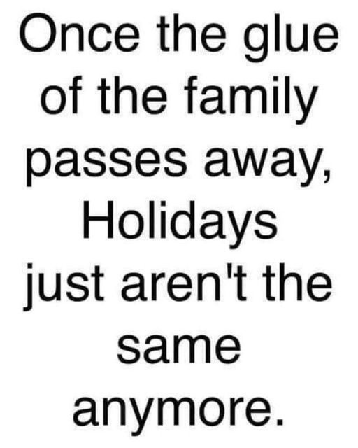May be an image of text that says 'Once the glue of the family passes away, Holidays just aren't the same anymore.'