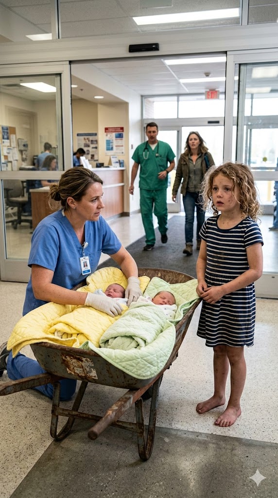 Doctors Thought the Squeaking in the Lobby Was Just a Broken Cart — Then a Barefoot Girl Pulled in a Rusted Wheelbarrow Whispering “My Brothers Won’t Wake Up,” and the ER Went Silent When They Saw What Was Inside