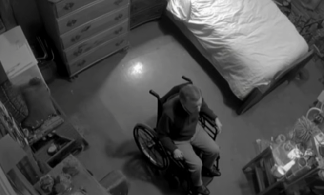 At 2:40, he heard a delivery at the door, sat down in the wheelchair parked near the hallway, rolled to the front door, signed for the package, rolled back inside, then stood up again and carried the box to the counter.