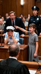 The girl, dressed in red, stood trembling, tears streaking her face as she pointed toward the front of the courtroom. The nanny, hands bound in cuffs, lowered her gaze. The billionaire seated nearby avoided looking at either of them, his expression hollow, as if the ground beneath him might collapse.