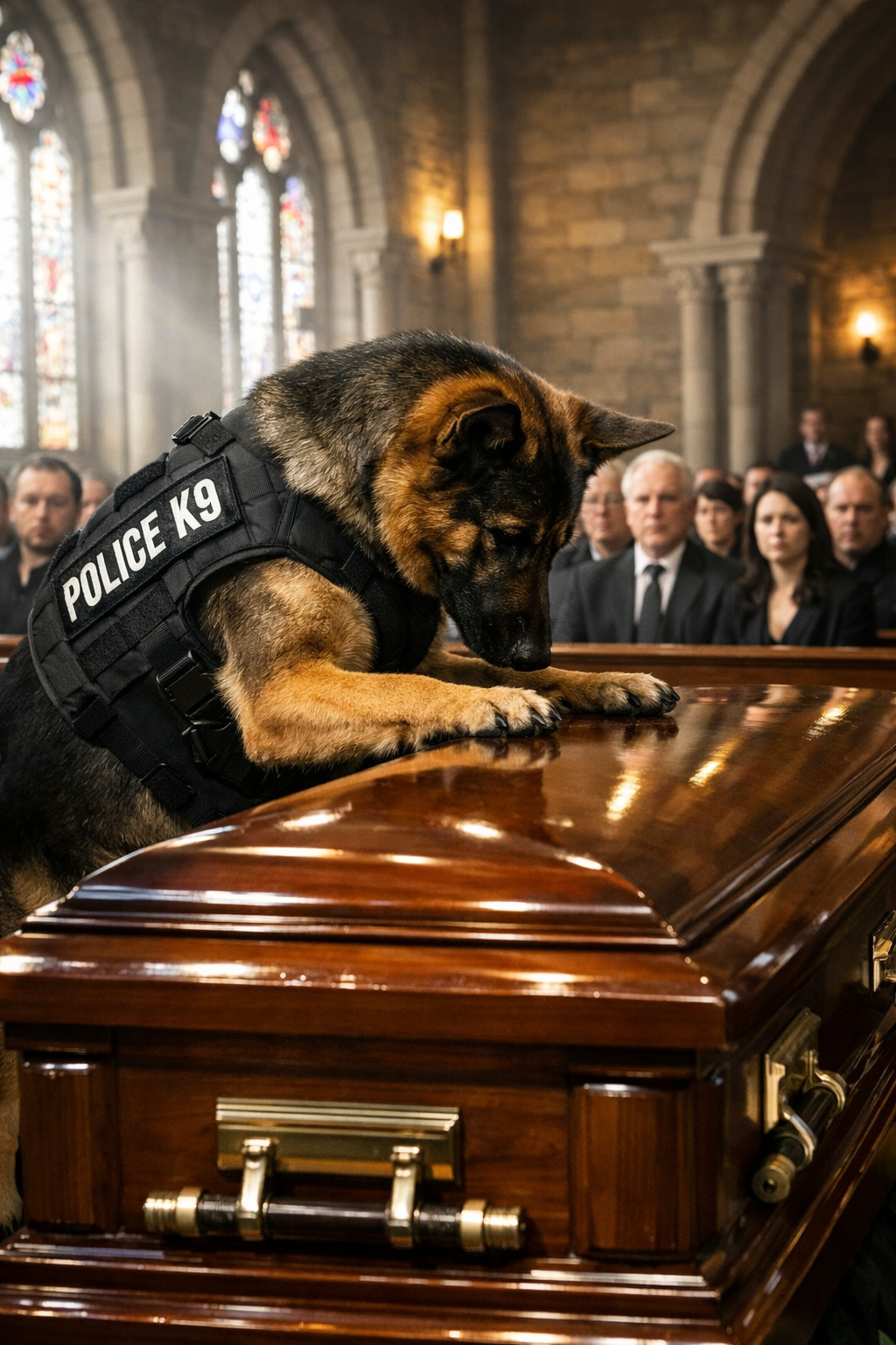 Rex padded toward the coffin, calm now, reverent. No barking, no growling—only the steady dignity of a partner who had kept a solemn promise. He sat beside the coffin, head bowed, as if the burden he had carried alone could finally rest.