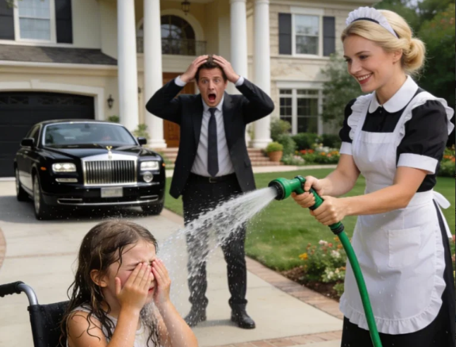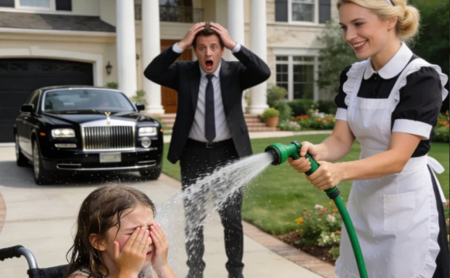 Beside her stood Sophie Miller, the family’s new young housemaid who could not have been older than sixteen. She held a garden hose firmly in her hands while water poured directly over Harper’s head without hesitation.
