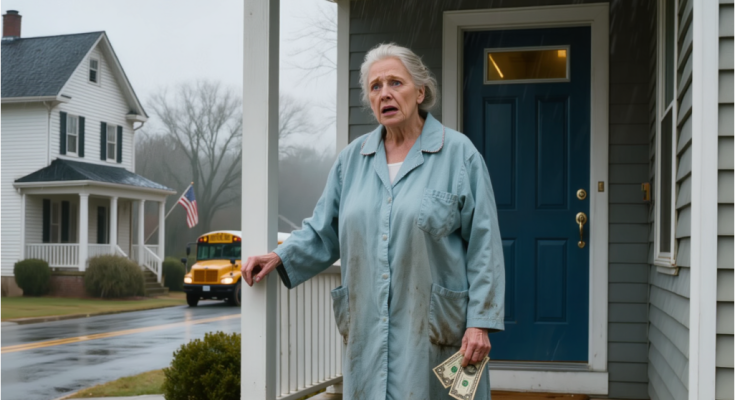 I stood there in a faded housecoat and bedroom slippers, breathing hard, staring at the blue front door of the split-level where I had spent the last eight years trying not to cost too much. Rain dripped from the porch roof in slow, patient taps. Across the street, a school bus stopped, took on two children in puffy coats, and moved on. A woman jogging with a stroller glanced up once, then kept going. Nothing in the world changed except me.