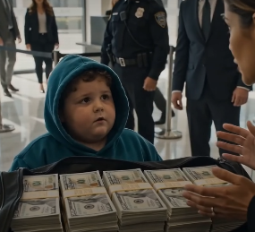 The bag hit the counter so hard the entire desk shook, a deep, jarring thud that cut through the quiet rhythm of the bank, and every head turned at once—because standing there, barely tall enough to reach the glass, was a chubby five-year-old boy in an oversized hoodie, completely calm, completely still, as if nothing about this moment was strange, “HEY—WHAT ARE YOU DOING?!” the teller snapped, startled, but the boy didn’t react, didn’t even look up at her, just slowly pulled the zipper open, and when the bag split apart—revealing stacks of tightly packed cash—the air in the room collapsed into silence, total, immediate, unnatural, as security shifted,