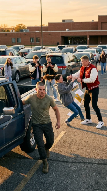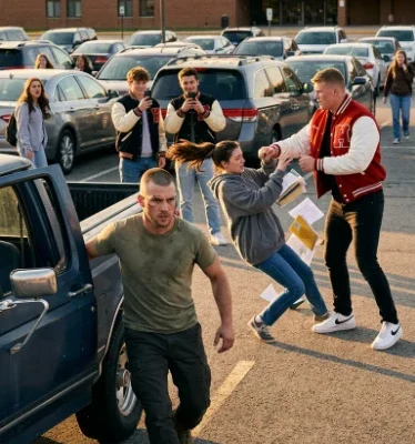 Inside my truck, the world goes completely quiet. The engine noise fades to nothing. The chatter of students disappears. The glare of the afternoon sun dims. My vision tunnels until the only thing I can see with crystal clarity is that red varsity jacket and the smirk on Brad’s face, the casual cruelty of someone who’s never been held accountable, who’s never faced someone who could fight back, who’s never learned that there are people in this world you don’t touch.